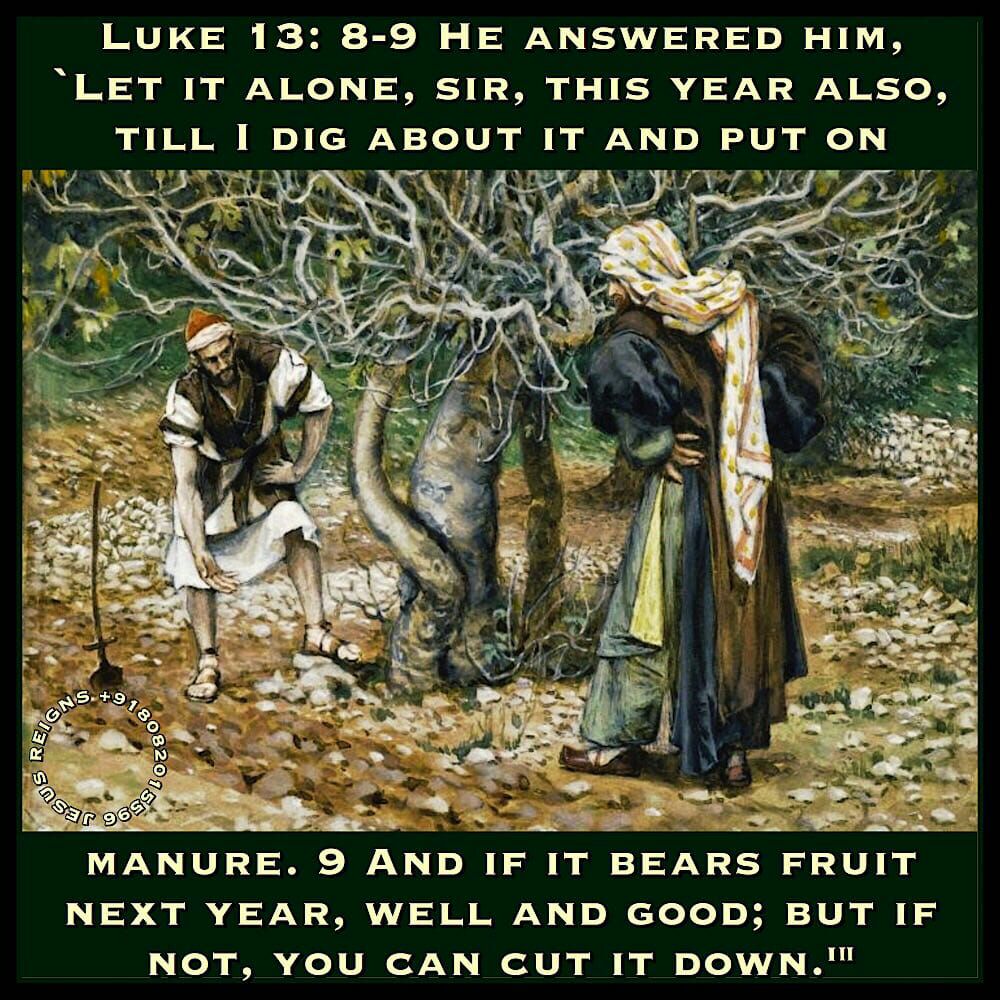 1 There were some present at that very time who told him of the Galileans whose blood Pilate had mingled with their sacrifices. 2 And he answered them, "Do you think that these Galileans were worse sinners than all the other Galileans, because they suffered thus? 3 I tell you, No; but unless you repent you will all likewise perish. 4 Or those eighteen upon whom the tower in Siloam fell and killed them, do you think that they were worse offenders than all the others who dwelt in Jerusalem? 5 I tell you, No; but unless you repent you will all likewise perish." 6 And he told this parable: "A man had a fig tree planted in his vineyard; and he came seeking fruit on it and found none. 7 And he said to the vinedresser, `Lo, these three years I have come seeking fruit on this fig tree, and I find none. Cut it down; why should it use up the ground?' 8 And he answered him, `Let it alone, sir, this year also, till I dig about it and put on manure. 9 And if it bears fruit next year, well and good; but if not, you can cut it down.'"