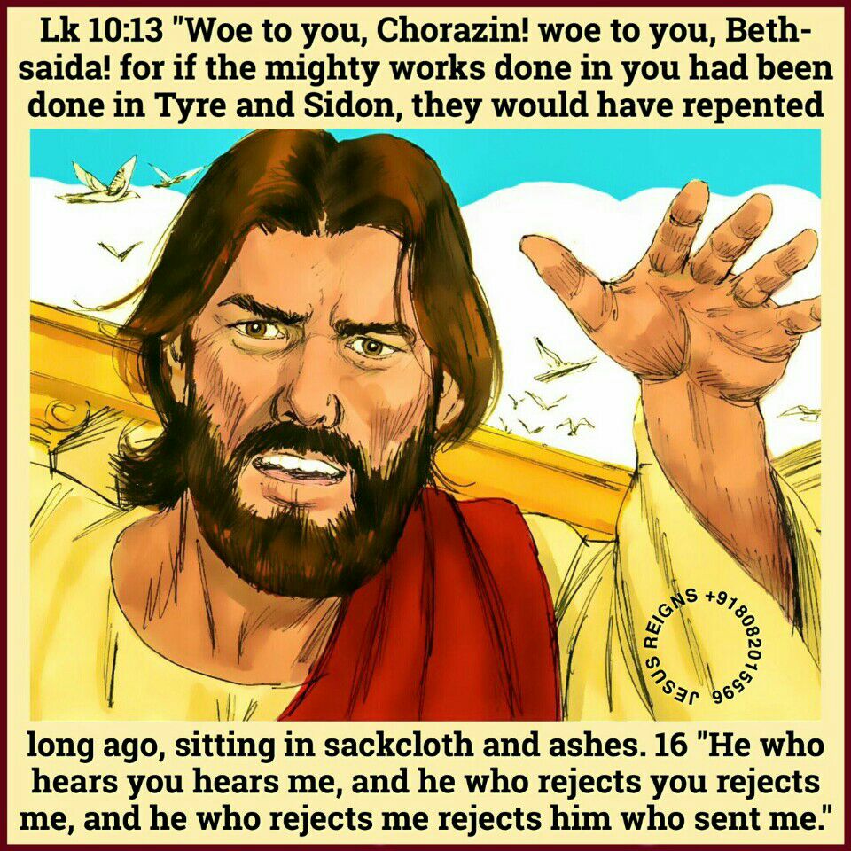 13 "Woe to you, Chorazin! woe to you, Bethsaida! for if the mighty works done in you had been done in Tyre and Sidon, they would have repented long ago, sitting in sackcloth and ashes. 14 But it shall be more tolerable in the judgment for Tyre and Sidon than for you. 15 And you, Capernaum, will you be exalted to heaven? You shall be brought down to Hades. 16 "He who hears you hears me, and he who rejects you rejects me, and he who rejects me rejects him who sent me."