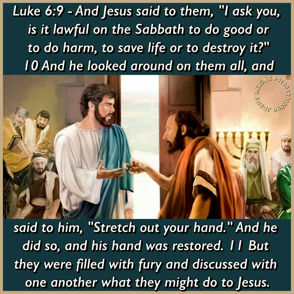 6 On another Sabbath, when he entered the synagogue and taught, a man was there whose right hand was withered. 7 And the scribes and the Pharisees watched him, to see whether he would heal on the Sabbath, so that they might find an accusation against him. 8 But he knew their thoughts, and he said to the man who had the withered hand, "Come and stand here." And he rose and stood there. 9 And Jesus said to them, "I ask you, is it lawful on the Sabbath to do good or to do harm, to save life or to destroy it?" 10 And he looked around on them all, and said to him, "Stretch out your hand." And he did so, and his hand was restored. 11 But they were filled with fury and discussed with one another what they might do to Jesus.