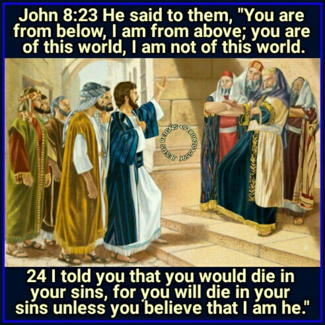 21 Again he said to them, "I go away, and you will seek me and die in your sin; where I am going, you cannot come." 22 Then said the Jews, "Will he kill himself, since he says, `Where I am going, you cannot come'?" 23 He said to them, "You are from below, I am from above; you are of this world, I am not of this world. 24 I told you that you would die in your sins, for you will die in your sins unless you believe that I am he." 25 They said to him, "Who are you?" Jesus said to them, "Even what I have told you from the beginning. 26 I have much to say about you and much to judge; but he who sent me is true, and I declare to the world what I have heard from him." 27 They did not understand that he spoke to them of the Father. 28 So Jesus said, "When you have lifted up the Son of man, then you will know that I am he, and that I do nothing on my own authority but speak thus as the Father taught me. 29 And he who sent me is with me; he has not left me alone, for I always do what is pleasing to him." 30 As he spoke thus, many believed in him.
