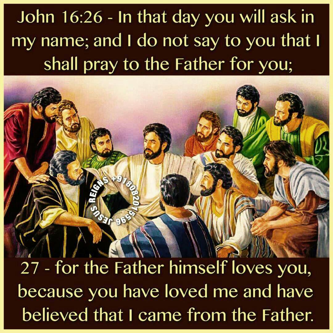 23 In that day you will ask nothing of me. Truly, truly, I say to you, if you ask anything of the Father, he will give it to you in my name. 24 Hitherto you have asked nothing in my name; ask, and you will receive, that your joy may be full. 25 "I have said this to you in figures; the hour is coming when I shall no longer speak to you in figures but tell you plainly of the Father. 26 In that day you will ask in my name; and I do not say to you that I shall pray to the Father for you; 27 for the Father himself loves you, because you have loved me and have believed that I came from the Father. 28 I came from the Father and have come into the world; again, I am leaving the world and going to the Father."