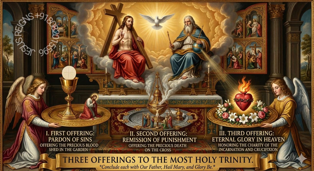We offer to the Most Holy Trinity the merits of Jesus Christ, in thanksgiving for the most precious Blood which He shed in the garden for us; and by His merits we beseech the Divine Majesty for pardon of our sins.