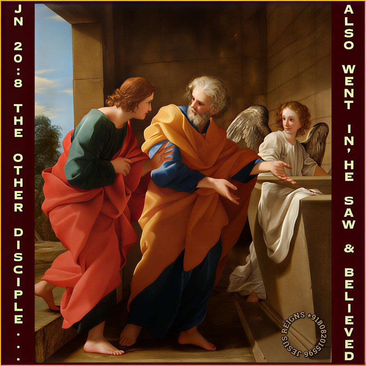 1 Now on the first day of the week Mary Magdalene came to the tomb early, while it was still dark, and saw that the stone had been taken away from the tomb. 2 So she ran, and went to Simon Peter and the other disciple, the one whom Jesus loved, and said to them, "They have taken the Lord out of the tomb, and we do not know where they have laid him." 3 Peter then came out with the other disciple, and they went toward the tomb. 4 They both ran, but the other disciple outran Peter and reached the tomb first; 5 and stooping to look in, he saw the linen cloths lying there, but he did not go in. 6 Then Simon Peter came, following him, and went into the tomb; he saw the linen cloths lying, 7 and the napkin, which had been on his head, not lying with the linen cloths but rolled up in a place by itself. 8 Then the other disciple, who reached the tomb first, also went in, and he saw and believed; 9 for as yet they did not know the scripture, that he must rise from the dead.