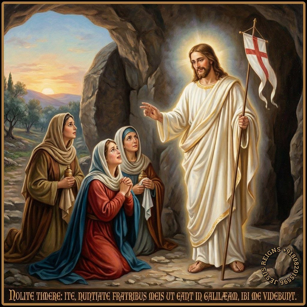 8 So they departed quickly from the tomb with fear and great joy, and ran to tell his disciples. 9 And behold, Jesus met them and said, "Hail!" And they came up and took hold of his feet and worshiped him. 10 Then Jesus said to them, "Do not be afraid; go and tell my brethren to go to Galilee, and there they will see me." 11 While they were going, behold, some of the guard went into the city and told the chief priests all that had taken place. 12 And when they had assembled with the elders and taken counsel, they gave a sum of money to the soldiers 13 and said, "Tell people, `His disciples came by night and stole him away while we were asleep.' 14 And if this comes to the governor's ears, we will satisfy him and keep you out of trouble." 15 So they took the money and did as they were directed; and this story has been spread among the Jews to this day.