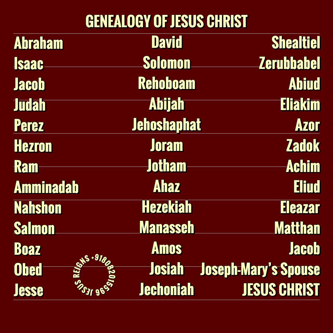 1 The book of the genealogy of Jesus Christ, the son of David, the son of Abraham. 2 Abraham was the father of Isaac, and Isaac the father of Jacob, and Jacob the father of Judah and his brothers, 3 and Judah the father of Perez and Zerah by Tamar, and Perez the father of Hezron, and Hezron the father of Ram, 4 and Ram the father of Amminadab, and Amminadab the father of Nahshon, and Nahshon the father of Salmon, 5 and Salmon the father of Boaz by Rahab, and Boaz the father of Obed by Ruth, and Obed the father of Jesse, 6 and Jesse the father of David the king. And David was the father of Solomon by the wife of Uriah, 7 and Solomon the father of Rehoboam, and Rehoboam the father of Abijah, and Abijah the father of Asa, 8 and Asa the father of Jehoshaphat, and Jehoshaphat the father of Joram, and Joram the father of Uzziah, 9 and Uzziah the father of Jotham, and Jotham the father of Ahaz, and Ahaz the father of Hezekiah, 10 and Hezekiah the father of Manasseh, and Manasseh the father of Amos, and Amos the father of Josiah, 11 and Josiah the father of Jechoniah and his brothers, at the time of the deportation to Babylon. 12 And after the deportation to Babylon: Jechoniah was the father of Shealtiel, and Shealtiel the father of Zerubbabel, 13 and Zerubbabel the father of Abiud, and Abiud the father of Eliakim, and Eliakim the father of Azor, 14 and Azor the father of Zadok, and Zadok the father of Achim, and Achim the father of Eliud, 15 and Eliud the father of Eleazar, and Eleazar the father of Matthan, and Matthan the father of Jacob, 16 and Jacob the father of Joseph the husband of Mary, of whom Jesus was born, who is called Christ. 17 So all the generations from Abraham to David were fourteen generations, and from David to the deportation to Babylon fourteen generations, and from the deportation to Babylon to the Christ fourteen generations.