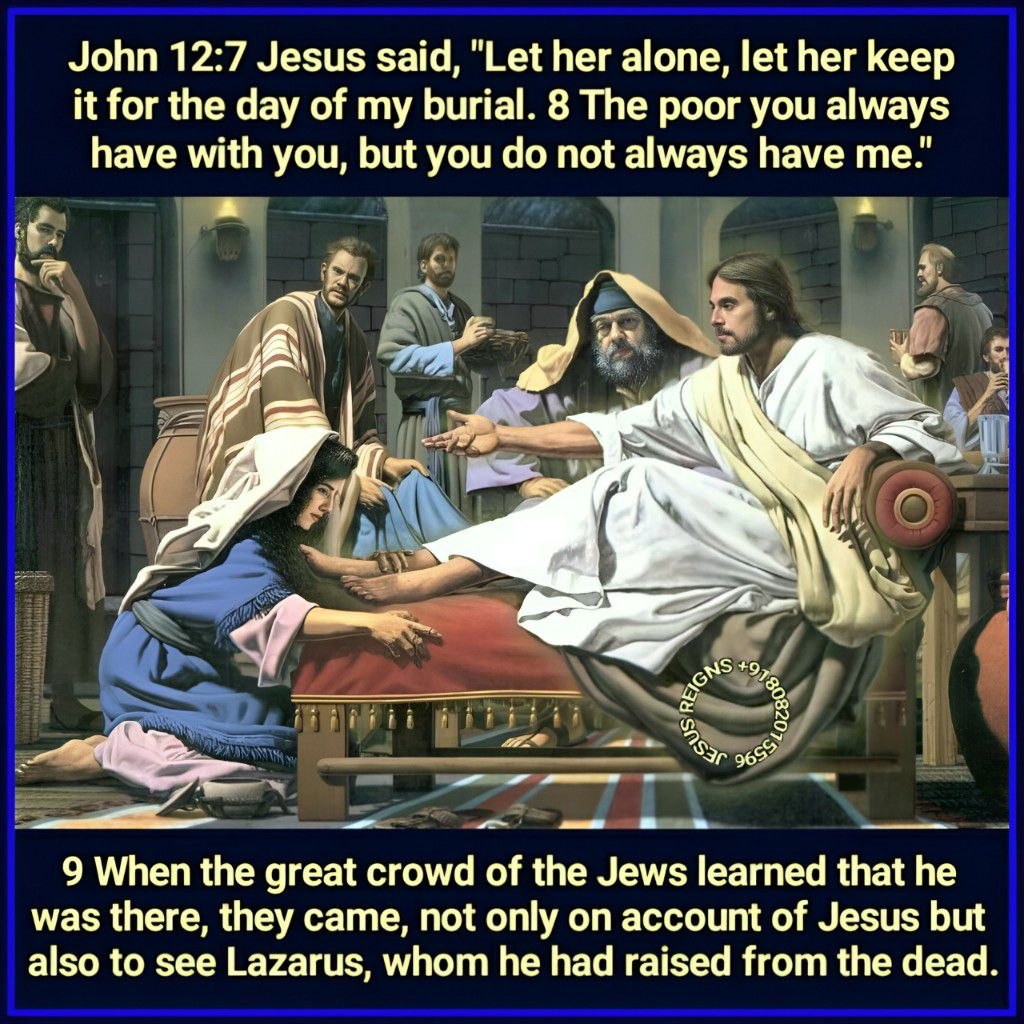1 Six days before the Passover, Jesus came to Bethany, where Lazarus was, whom Jesus had raised from the dead. 2 There they made him a supper; Martha served, and Lazarus was one of those at table with him. 3 Mary took a pound of costly ointment of pure nard and anointed the feet of Jesus and wiped his feet with her hair; and the house was filled with the fragrance of the ointment. 4 But Judas Iscariot, one of his disciples (he who was to betray him), said, 5 "Why was this ointment not sold for three hundred denarii and given to the poor?" 6 This he said, not that he cared for the poor but because he was a thief, and as he had the money box he used to take what was put into it. 7 Jesus said, "Let her alone, let her keep it for the day of my burial. 8 The poor you always have with you, but you do not always have me." 9 When the great crowd of the Jews learned that he was there, they came, not only on account of Jesus but also to see Lazarus, whom he had raised from the dead. 10 So the chief priests planned to put Lazarus also to death, 11 because on account of him many of the Jews were going away and believing in Jesus.
