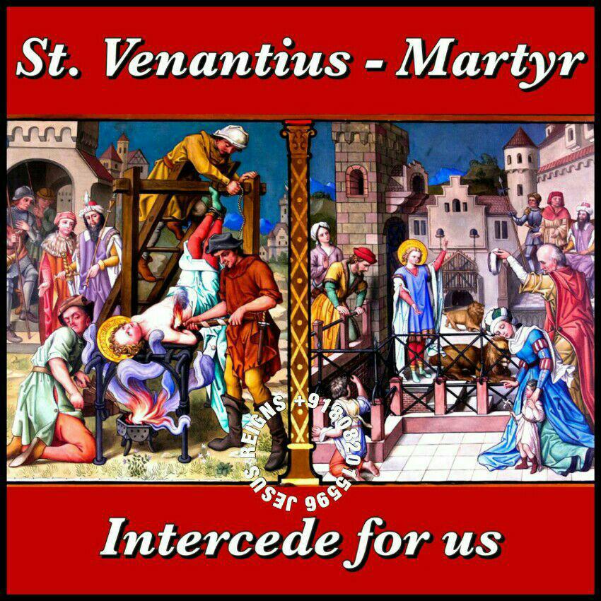 Venantius, who was born at Camerino, was but fifteen years of age when he was accused of being a Christian, and arraigned before Antiochus, the Governor of the City, under the reign of the Emperor Decius. He presented himself to the Governor at the City Gate, where, after being long and uselessly coaxed and threatened, he was scourged, and condemned to be chained. But he was miraculously unfettered by an Angel, and was then burned with torches, and was hung, with his head downwards, over a fire, that he might be suffocated by the smoke. One of the officials, by name Anastasius, having noticed the courage wherewith he suffered his torments, and having also seen an Angel walking, in a white robe, above the smoke, and again liberating Venantius,--he believed in Christ, and, together with his family, was baptized by the priest Porphyrius, with whom he afterwards merited to receive the palm of martyrdom.