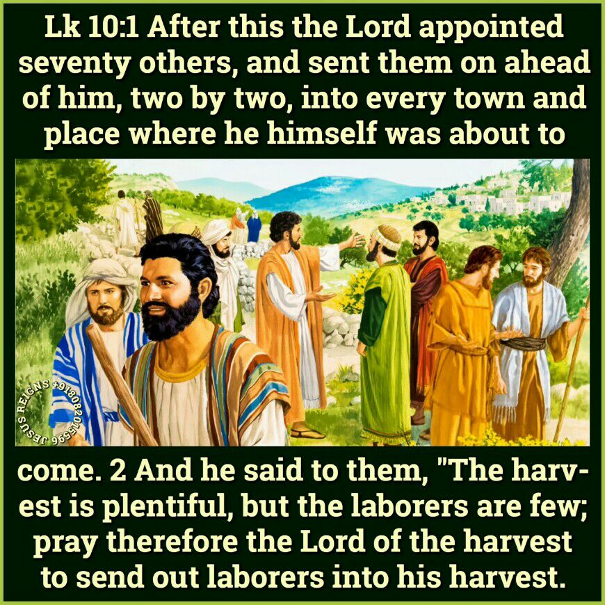 1 After this the Lord appointed seventy others, and sent them on ahead of him, two by two, into every town and place where he himself was about to come. 2 And he said to them, "The harvest is plentiful, but the laborers are few; pray therefore the Lord of the harvest to send out laborers into his harvest. 3 Go your way; behold, I send you out as lambs in the midst of wolves. 4 Carry no purse, no bag, no sandals; and salute no one on the road. 5 Whatever house you enter, first say, `Peace be to this house!' 6 And if a son of peace is there, your peace shall rest upon him; but if not, it shall return to you. 7 And remain in the same house, eating and drinking what they provide, for the laborer deserves his wages; do not go from house to house. 8 Whenever you enter a town and they receive you, eat what is set before you; 9 heal the sick in it and say to them, `The kingdom of God has come near to you.' 10 But whenever you enter a town and they do not receive you, go into its streets and say, 11 `Even the dust of your town that clings to our feet, we wipe off against you; nevertheless know this, that the kingdom of God has come near.' 12 I tell you, it shall be more tolerable on that day for Sodom than for that town.