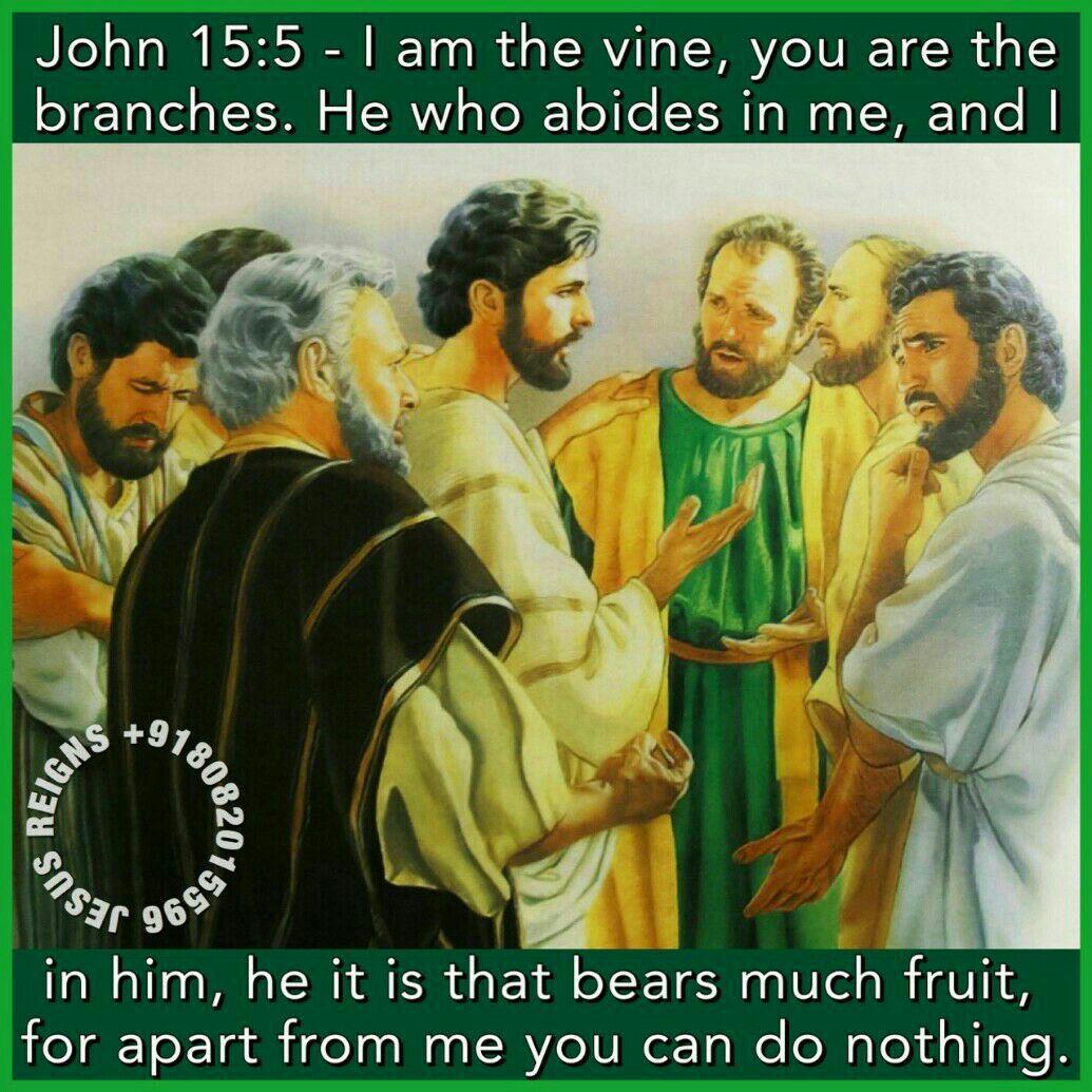 1 "I am the true vine, and my Father is the vine dresser. 2 Every branch of mine that bears no fruit, he takes away, and every branch that does bear fruit he prunes, that it may bear more fruit. 3 You are already made clean by the word which I have spoken to you. 4 Abide in me, and I in you. As the branch cannot bear fruit by itself, unless it abides in the vine, neither can you, unless you abide in me. 5 I am the vine, you are the branches. He who abides in me, and I in him, he it is that bears much fruit, for apart from me you can do nothing. 6 If a man does not abide in me, he is cast forth as a branch and withers; and the branches are gathered, thrown into the fire and burned. 7 If you abide in me, and my words abide in you, ask whatever you will, and it shall be done for you. 8 By this my Father is glorified, that you bear much fruit, and so prove to be my disciples.