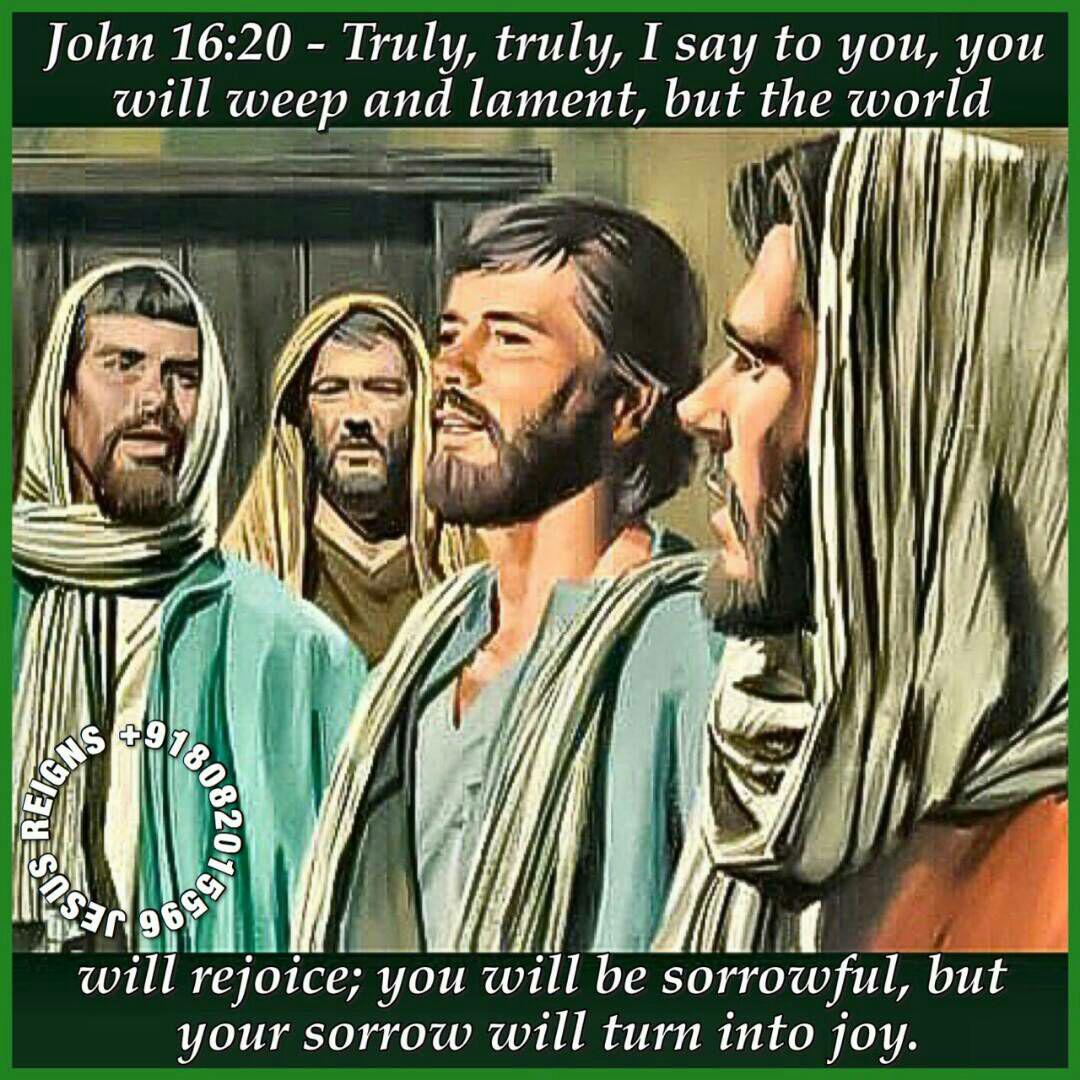 16 "A little while, and you will see me no more; again a little while, and you will see me." 17 Some of his disciples said to one another, "What is this that he says to us, `A little while, and you will not see me, and again a little while, and you will see me'; and, `because I go to the Father'?" 18 They said, "What does he mean by `a little while'? We do not know what he means." 19 Jesus knew that they wanted to ask him; so he said to them, "Is this what you are asking yourselves, what I meant by saying, `A little while, and you will not see me, and again a little while, and you will see me'? 20 Truly, truly, I say to you, you will weep and lament, but the world will rejoice; you will be sorrowful, but your sorrow will turn into joy.