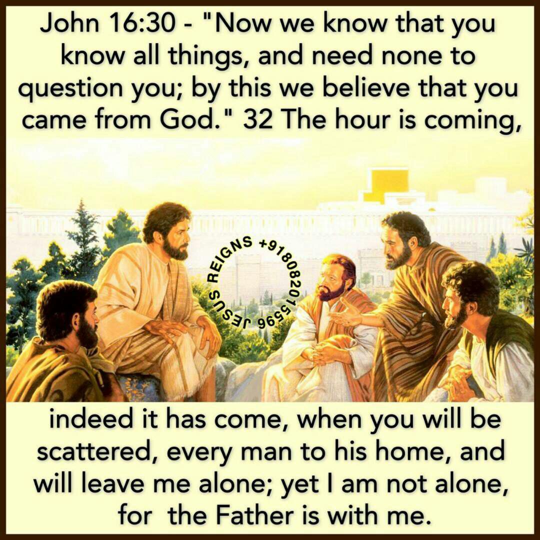 29 His disciples said, "Ah, now you are speaking plainly, not in any figure! 30 Now we know that you know all things, and need none to question you; by this we believe that you came from God." 31 Jesus answered them, "Do you now believe? 32 The hour is coming, indeed it has come, when you will be scattered, every man to his home, and will leave me alone; yet I am not alone, for the Father is with me. 33 I have said this to you, that in me you may have peace. In the world you have tribulation; but be of good cheer, I have overcome the world."