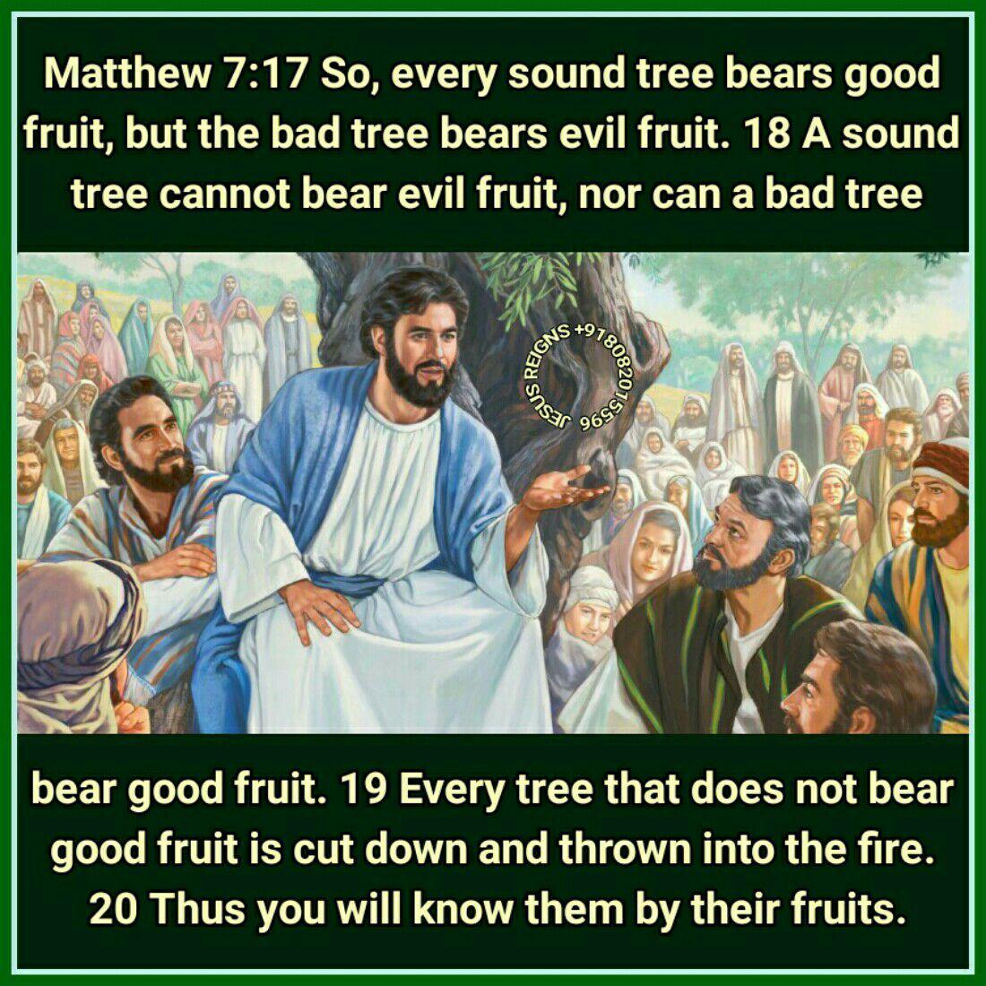 15 "Beware of false prophets, who come to you in sheep's clothing but inwardly are ravenous wolves. 16 You will know them by their fruits. Are grapes gathered from thorns, or figs from thistles? 17 So, every sound tree bears good fruit, but the bad tree bears evil fruit. 18 A sound tree cannot bear evil fruit, nor can a bad tree bear good fruit. 19 Every tree that does not bear good fruit is cut down and thrown into the fire. 20 Thus you will know them by their fruits.