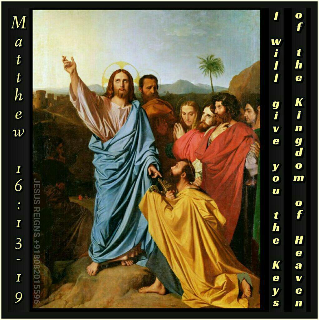 13 Now when Jesus came into the district of Caesarea Philippi, he asked his disciples, "Who do men say that the Son of man is?" 14 And they said, "Some say John the Baptist, others say Elijah, and others Jeremiah or one of the prophets." 15 He said to them, "But who do you say that I am?"16 Simon Peter replied, "You are the Christ, the Son of the living God." 17 And Jesus answered him, "Blessed are you, Simon BarJona! For flesh and blood has not revealed this to you, but my Father who is in heaven. 18 And I tell you, you are Peter, and on this rock I will build my church, and the powers of death shall not prevail against it. 19 I will give you the keys of the kingdom of heaven, and whatever you bind on earth shall be bound in heaven, and whatever you loose on earth shall be loosed in heaven."
