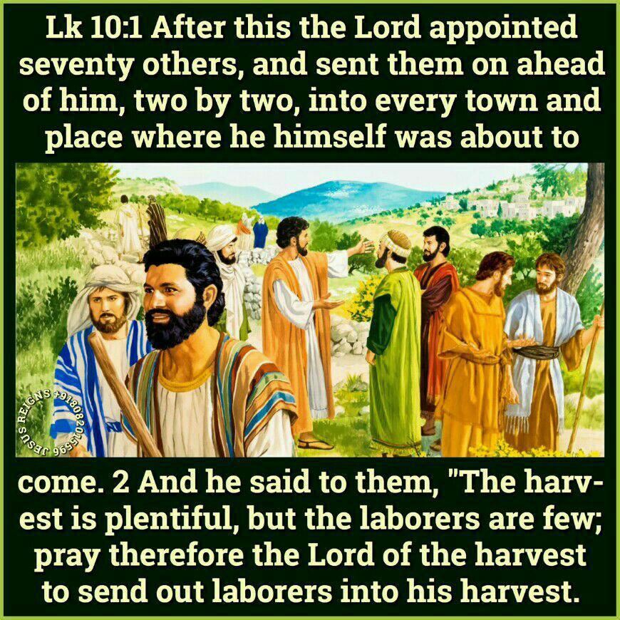 1 After this the Lord appointed seventy others, and sent them on ahead of him, two by two, into every town and place where he himself was about to come. 2 And he said to them, "The harvest is plentiful, but the laborers are few; pray therefore the Lord of the harvest to send out laborers into his harvest. 3 Go your way; behold, I send you out as lambs in the midst of wolves. 4 Carry no purse, no bag, no sandals; and salute no one on the road. 5 Whatever house you enter, first say, `Peace be to this house!' 6 And if a son of peace is there, your peace shall rest upon him; but if not, it shall return to you. 7 And remain in the same house, eating and drinking what they provide, for the laborer deserves his wages; do not go from house to house. 8 Whenever you enter a town and they receive you, eat what is set before you; 9 heal the sick in it and say to them, `The kingdom of God has come near to you.' 10 But whenever you enter a town and they do not receive you, go into its streets and say, 11 `Even the dust of your town that clings to our feet, we wipe off against you; nevertheless know this, that the kingdom of God has come near.' 12 I tell you, it shall be more tolerable on that day for Sodom than for that town.