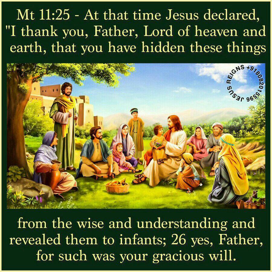 25 At that time Jesus declared, "I thank you, Father, Lord of heaven and earth, that you have hidden these things from the wise and understanding and revealed them to infants; 26 yes, Father, for such was your gracious will. 27 All things have been delivered to me by my Father; and no one knows the Son except the Father, and no one knows the Father except the Son and any one to whom the Son chooses to reveal him."