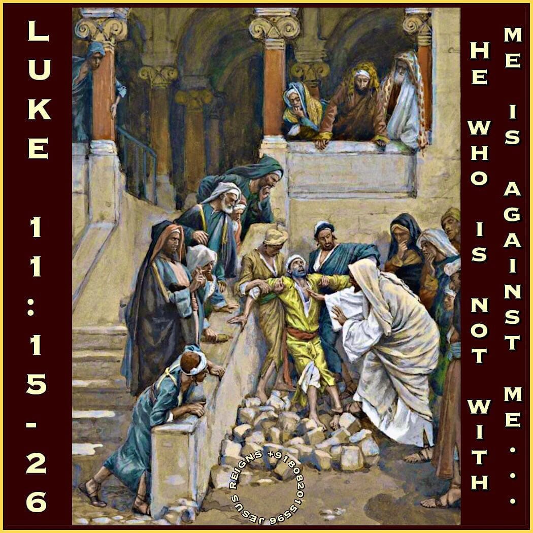 15 But some of them said, "He casts out demons by Beelzebul, the prince of demons"; 16 while others, to test him, sought from him a sign from heaven. 17 But he, knowing their thoughts, said to them, "Every kingdom divided against itself is laid waste, and a divided household falls. 18 And if Satan also is divided against himself, how will his kingdom stand? For you say that I cast out demons by Beelzebul. 19 And if I cast out demons by Beelzebul, by whom do your sons cast them out? Therefore they shall be your judges. 20 But if it is by the finger of God that I cast out demons, then the kingdom of God has come upon you. 21 When a strong man, fully armed, guards his own palace, his goods are in peace; 22 but when one stronger than he assails him and overcomes him, he takes away his armor in which he trusted, and divides his spoil. 23 He who is not with me is against me, and he who does not gather with me scatters. 24 "When the unclean spirit has gone out of a man, he passes through waterless places seeking rest; and finding none he says, `I will return to my house from which I came.' 25 And when he comes he finds it swept and put in order. 26 Then he goes and brings seven other spirits more evil than himself, and they enter and dwell there; and the last state of that man becomes worse than the first.