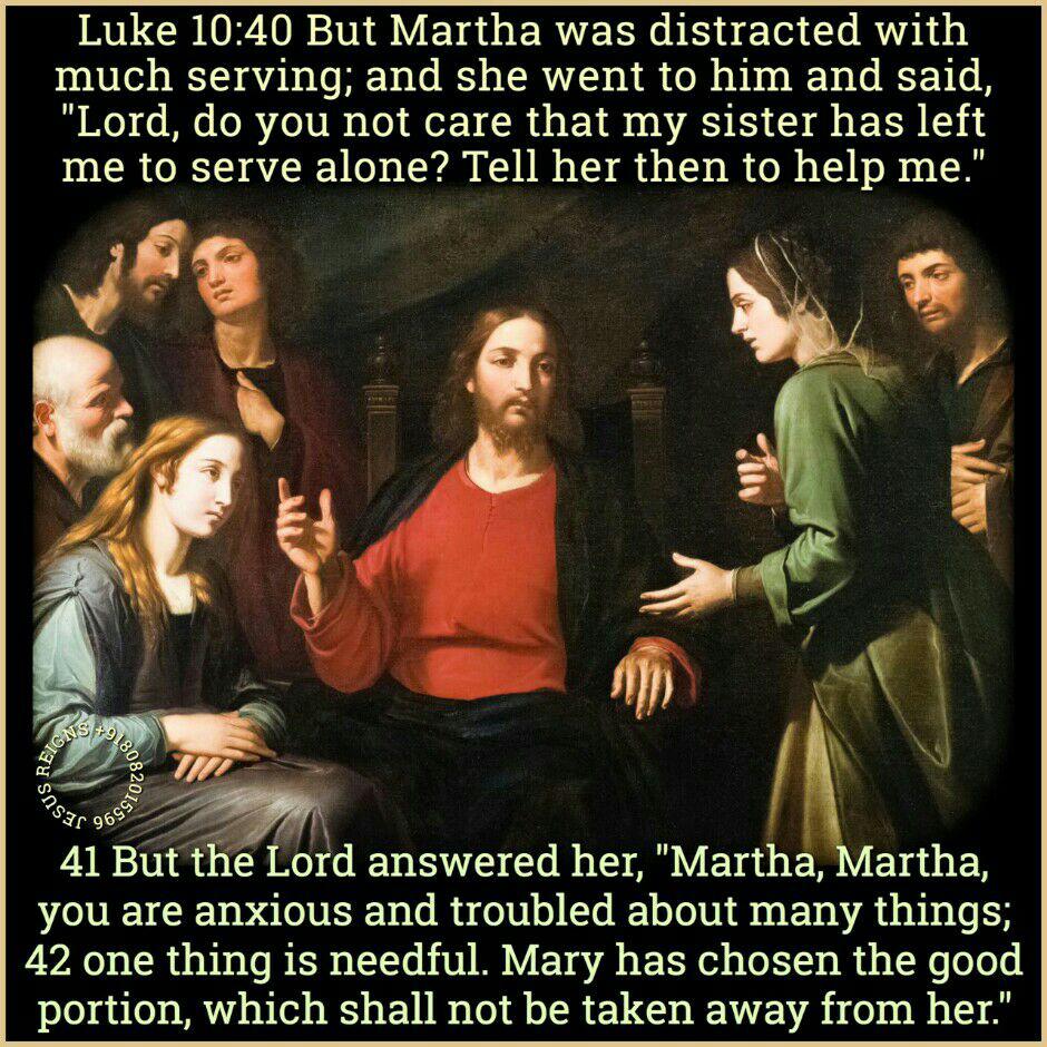38 Now as they went on their way, he entered a village; and a woman named Martha received him into her house. 39 And she had a sister called Mary, who sat at the Lord's feet and listened to his teaching. 40 But Martha was distracted with much serving; and she went to him and said, "Lord, do you not care that my sister has left me to serve alone? Tell her then to help me." 41 But the Lord answered her, "Martha, Martha, you are anxious and troubled about many things; 42 one thing is needful. Mary has chosen the good portion, which shall not be taken away from her."