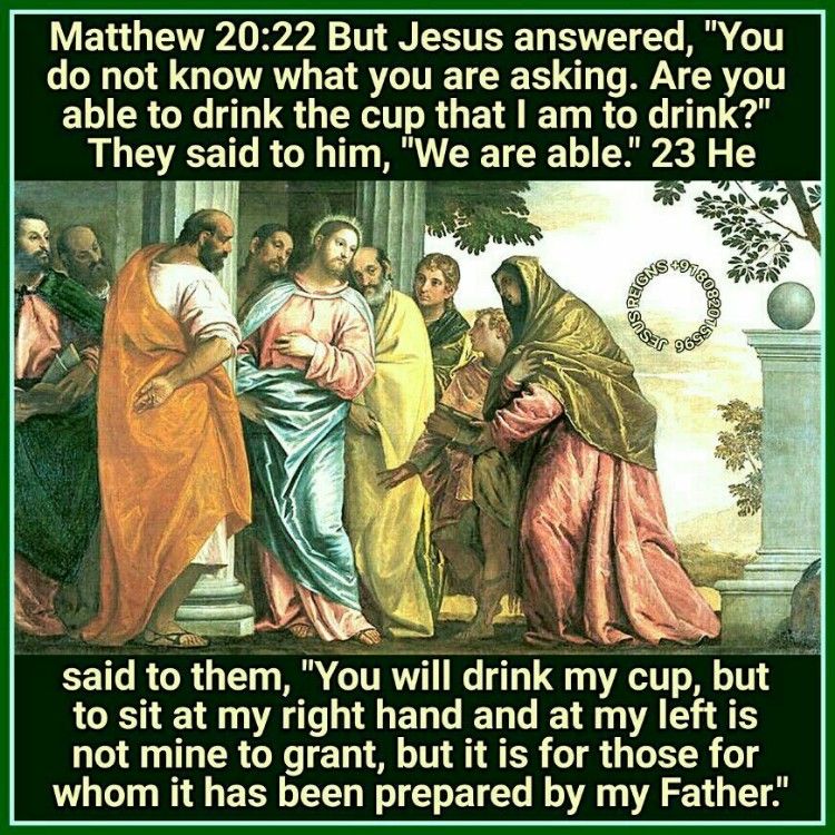 20 Then the mother of the sons of Zebedee came up to him, with her sons, and kneeling before him she asked him for something. 21 And he said to her, "What do you want?" She said to him, "Command that these two sons of mine may sit, one at your right hand and one at your left, in your kingdom." 22 But Jesus answered, "You do not know what you are asking. Are you able to drink the cup that I am to drink?" They said to him, "We are able." 23 He said to them, "You will drink my cup, but to sit at my right hand and at my left is not mine to grant, but it is for those for whom it has been prepared by my Father." 24 And when the ten heard it, they were indignant at the two brothers. 25 But Jesus called them to him and said, "You know that the rulers of the Gentiles lord it over them, and their great men exercise authority over them. 26 It shall not be so among you; but whoever would be great among you must be your servant, 27 and whoever would be first among you must be your slave; 28 even as the Son of man came not to be served but to serve, and to give his life as a ransom for many."