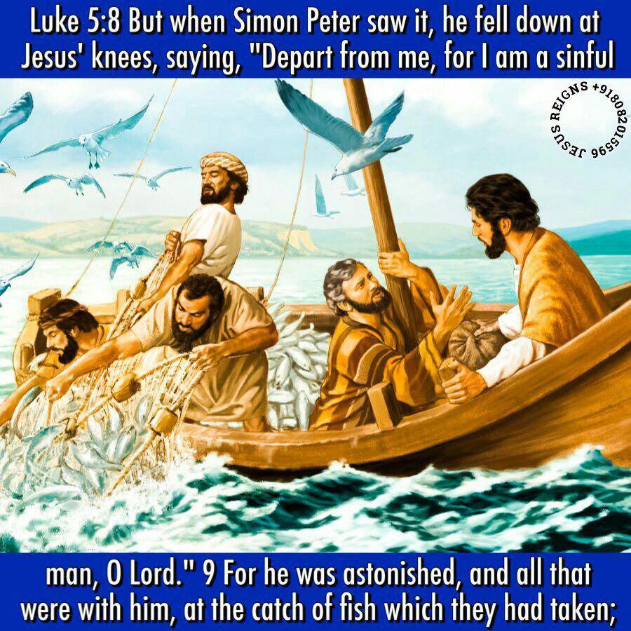 1 While the people pressed upon him to hear the word of God, he was standing by the lake of Gennesaret. 2 And he saw two boats by the lake; but the fishermen had gone out of them and were washing their nets. 3 Getting into one of the boats, which was Simon's, he asked him to put out a little from the land. And he sat down and taught the people from the boat. 4 And when he had ceased speaking, he said to Simon, "Put out into the deep and let down your nets for a catch." 5 And Simon answered, "Master, we toiled all night and took nothing! But at your word I will let down the nets." 6 And when they had done this, they enclosed a great shoal of fish; and as their nets were breaking, 7 they beckoned to their partners in the other boat to come and help them. And they came and filled both the boats, so that they began to sink. 8 But when Simon Peter saw it, he fell down at Jesus' knees, saying, "Depart from me, for I am a sinful man, O Lord." 9 For he was astonished, and all that were with him, at the catch of fish which they had taken; 10 and so also were James and John, sons of Zebedee, who were partners with Simon. And Jesus said to Simon, "Do not be afraid; henceforth you will be catching men." 11 And when they had brought their boats to land, they left everything and followed him.