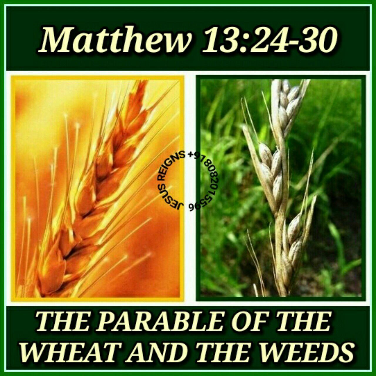 24 Another parable he put before them, saying, "The kingdom of heaven may be compared to a man who sowed good seed in his field; 25 but while men were sleeping, his enemy came and sowed weeds among the wheat, and went away. 26 So when the plants came up and bore grain, then the weeds appeared also. 27 And the servants of the householder came and said to him, Sir, did you not sow good seed in your field? How then has it weeds?' 28 He said to them, `An enemy has done this.' The servants said to him, `Then do you want us to go and gather them?' 29 But he said, `No; lest in gathering the weeds you root up the wheat along with them. 30 Let both grow together until the harvest; and at harvest time I will tell the reapers, Gather the weeds first and bind them in bundles to be burned, but gather the wheat into my barn.'"