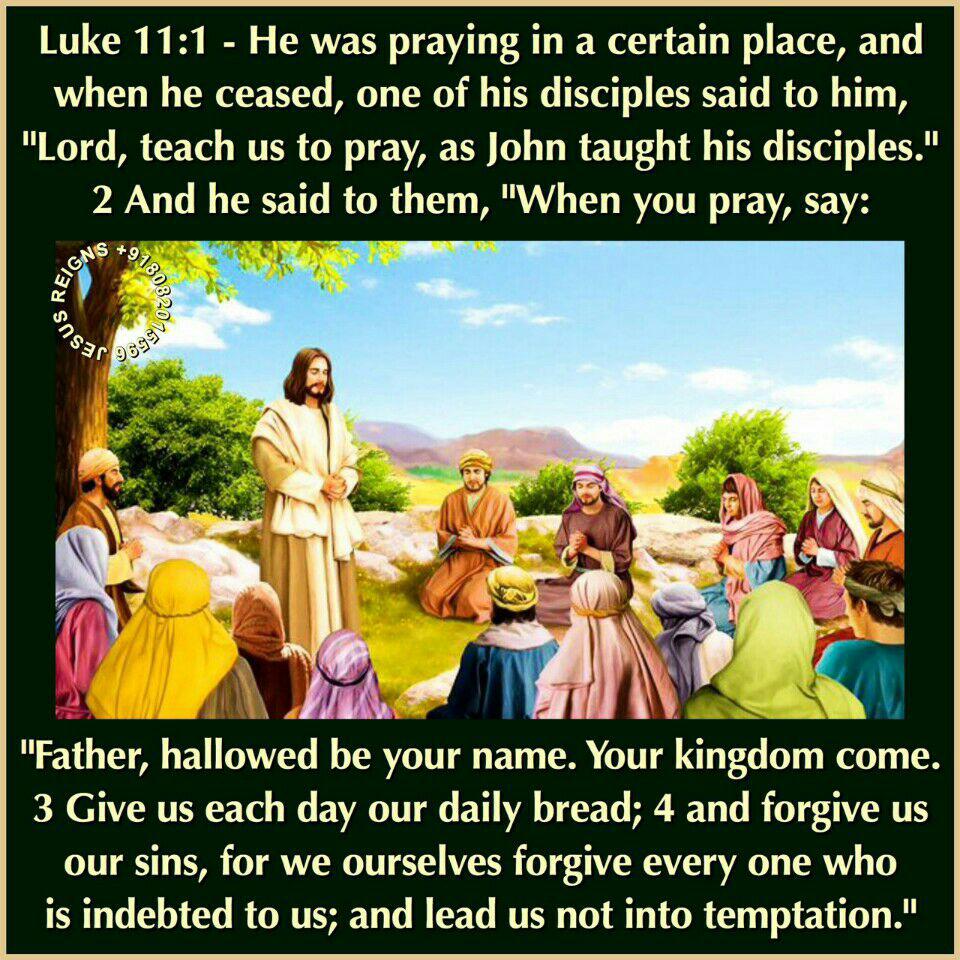 1 He was praying in a certain place, and when he ceased, one of his disciples said to him, "Lord, teach us to pray, as John taught his disciples." 2 And he said to them, "When you pray, say: "Father, hallowed be your name. Your kingdom come. 3 Give us each day our daily bread; 4 and forgive us our sins, for we ourselves forgive every one who is indebted to us; and lead us not into temptation."