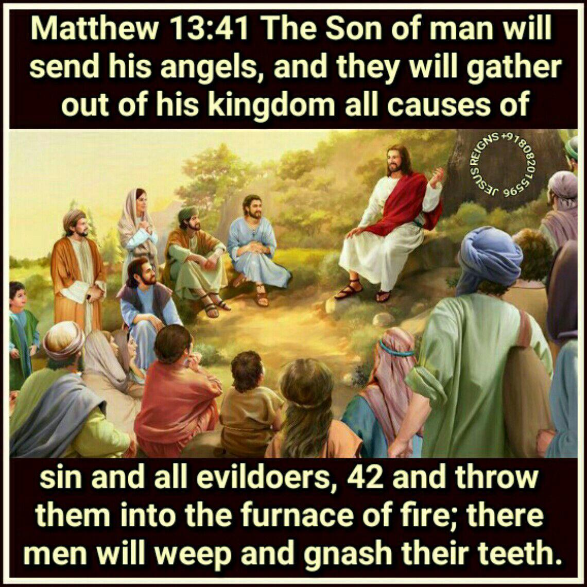 36 Then he left the crowds and went into the house. And his disciples came to him, saying, "Explain to us the parable of the weeds of the field." 37 He answered, "He who sows the good seed is the Son of man; 38 the field is the world, and the good seed means the sons of the kingdom; the weeds are the sons of the evil one, 39 and the enemy who sowed them is the devil; the harvest is the close of the age, and the reapers are angels. 40 Just as the weeds are gathered and burned with fire, so will it be at the close of the age. 41 The Son of man will send his angels, and they will gather out of his kingdom all causes of sin and all evildoers, 42 and throw them into the furnace of fire; there men will weep and gnash their teeth. 43 Then the righteous will shine like the sun in the kingdom of their Father. He who has ears, let him hear.