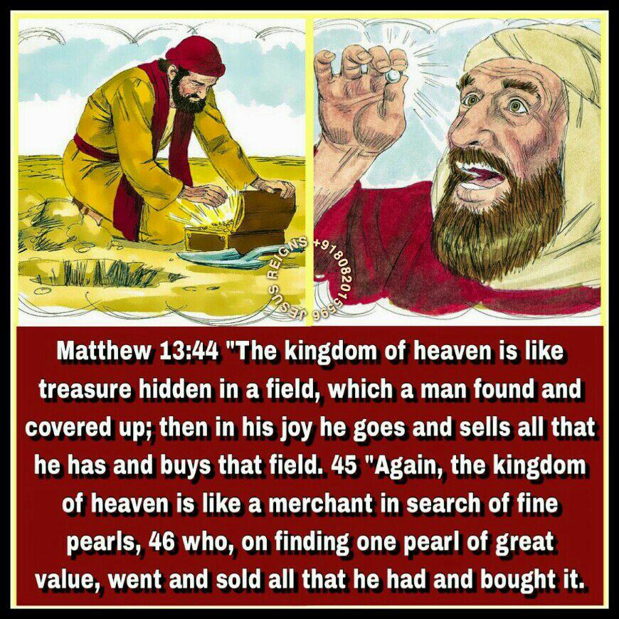 44 "The kingdom of heaven is like treasure hidden in a field, which a man found and covered up; then in his joy he goes and sells all that he has and buys that field. 45 "Again, the kingdom of heaven is like a merchant in search of fine pearls, 46 who, on finding one pearl of great value, went and sold all that he had and bought it.