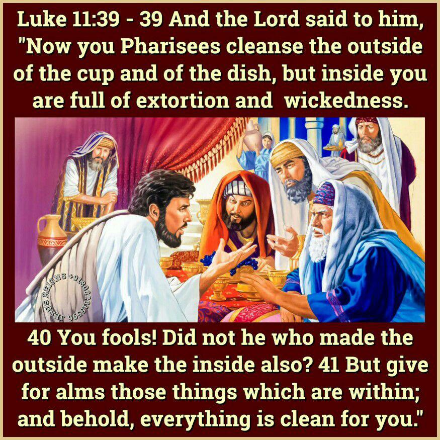 37 While he was speaking, a Pharisee asked him to dine with him; so he went in and sat at table. 38 The Pharisee was astonished to see that he did not first wash before dinner. 39 And the Lord said to him, "Now you Pharisees cleanse the outside of the cup and of the dish, but inside you are full of extortion and wickedness. 40 You fools! Did not he who made the outside make the inside also? 41 But give for alms those things which are within; and behold, everything is clean for you.