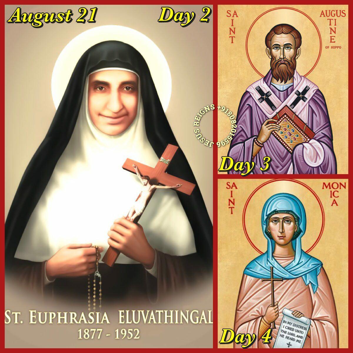 Jesus, you took the form of a servant to redeem mankind. You assign people on earth, suitable to your Heart to realize your Father's will. We praise you for this. The present world with all its crookedness and vices, has to be brought to the bright light of faith and purity. For this, you have selected St. Euphrasia also along with other saints, we thank you. To be light where there is darkness, to be comfort to the disturbed, to be a corrective force for sinners, to be a support to the weak souls to ascend the steps of holiness, to be a lodestar to grow in the love of God and man, you have given us our Mother, St. Euphrasia, we praise and thank you. We too desire to bring many people to the path of prayer and sanctity. We pray for all these graces, for our intentions and prayers which we offer through this novena be heard and answered so that Jesus be glorified. Amen.
