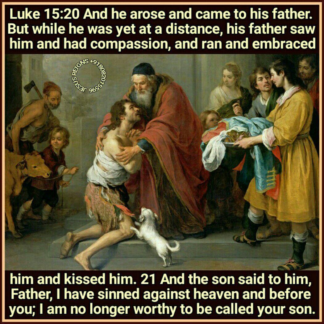 11 And he said, "There was a man who had two sons; 12 and the younger of them said to his father, `Father, give me the share of property that falls to me.' And he divided his living between them. 13 Not many days later, the younger son gathered all he had and took his journey into a far country, and there he squandered his property in loose living. 14 And when he had spent everything, a great famine arose in that country, and he began to be in want. 15 So he went and joined himself to one of the citizens of that country, who sent him into his fields to feed swine. 16 And he would gladly have fed on the pods that the swine ate; and no one gave him anything. 17 But when he came to himself he said, `How many of my father's hired servants have bread enough and to spare, but I perish here with hunger! 18 I will arise and go to my father, and I will say to him, "Father, I have sinned against heaven and before you; 19 I am no longer worthy to be called your son; treat me as one of your hired servants."' 20 And he arose and came to his father. But while he was yet at a distance, his father saw him and had compassion, and ran and embraced him and kissed him. 21 And the son said to him, `Father, I have sinned against heaven and before you; I am no longer worthy to be called your son.' 22 But the father said to his servants, `Bring quickly the best robe, and put it on him; and put a ring on his hand, and shoes on his feet; 23 and bring the fatted calf and kill it, and let us eat and make merry; 24 for this my son was dead, and is alive again; he was lost, and is found.' And they began to make merry.