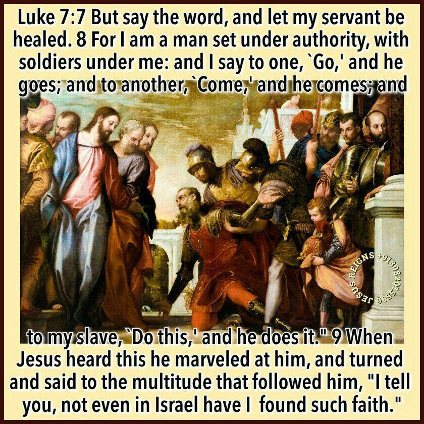1 After he had ended all his sayings in the hearing of the people he entered Capernaum. 2 Now a centurion had a slave who was dear to him, who was sick and at the point of death. 3 When he heard of Jesus, he sent to him elders of the Jews, asking him to come and heal his slave. 4 And when they came to Jesus, they begged him earnestly, saying, "He is worthy to have you do this for him, 5 for he loves our nation, and he built us our synagogue."6 And Jesus went with them. When he was not far from the house, the centurion sent friends to him, saying to him, "Lord, do not trouble yourself, for I am not worthy to have you come under my roof; 7 therefore I did not presume to come to you. But say the word, and let my servant be healed. 8 For I am a man set under authority, with soldiers under me: and I say to one, `Go,' and he goes; and to another, `Come,' and he comes; and to my slave, `Do this,' and he does it." 9 When Jesus heard this he marveled at him, and turned and said to the multitude that followed him, "I tell you, not even in Israel have I found such faith." 10 And when those who had been sent returned to the house, they found the slave well.