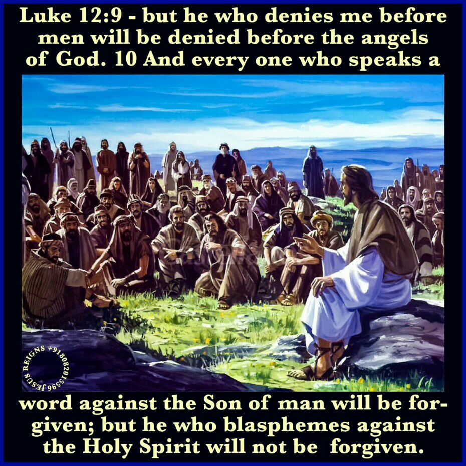 8 "And I tell you, every one who acknowledges me before men, the Son of man also will acknowledge before the angels of God; 9 but he who denies me before men will be denied before the angels of God. 10 And every one who speaks a word against the Son of man will be forgiven; but he who blasphemes against the Holy Spirit will not be forgiven. 11 And when they bring you before the synagogues and the rulers and the authorities, do not be anxious how or what you are to answer or what you are to say; 12 for the Holy Spirit will teach you in that very hour what you ought to say."