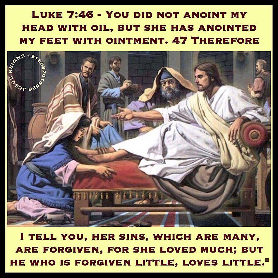 44 Then turning toward the woman he said to Simon, "Do you see this woman? I entered your house, you gave me no water for my feet, but she has wet my feet with her tears and wiped them with her hair. 45 You gave me no kiss, but from the time I came in she has not ceased to kiss my feet. 46 You did not anoint my head with oil, but she has anointed my feet with ointment. 47 Therefore I tell you, her sins, which are many, are forgiven, for she loved much; but he who is forgiven little, loves little." 48 And he said to her, "Your sins are forgiven." 49 Then those who were at table with him began to say among themselves, "Who is this, who even forgives sins?" 50 And he said to the woman, "Your faith has saved you; go in peace."