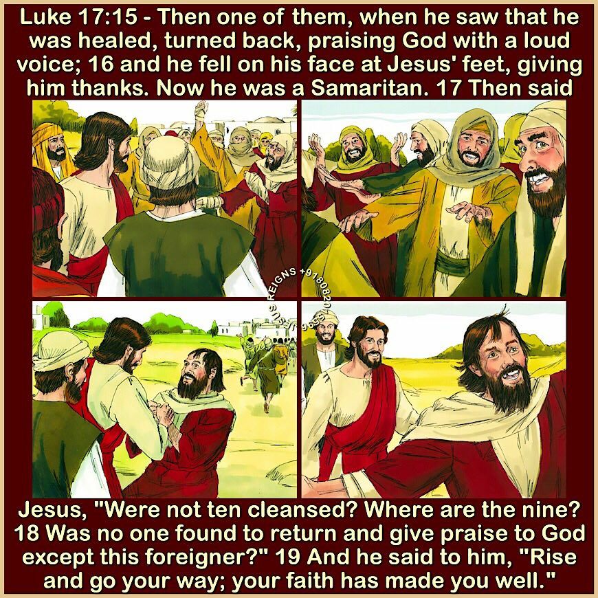 11 On the way to Jerusalem he was passing along between Samaria and Galilee. 12 And as he entered a village, he was met by ten lepers, who stood at a distance 13 and lifted up their voices and said, "Jesus, Master, have mercy on us." 14 When he saw them he said to them, "Go and show yourselves to the priests." And as they went they were cleansed. 15 Then one of them, when he saw that he was healed, turned back, praising God with a loud voice; 16 and he fell on his face at Jesus' feet, giving him thanks. Now he was a Samaritan. 17 Then said Jesus, "Were not ten cleansed? Where are the nine? 18 Was no one found to return and give praise to God except this foreigner?" 19 And he said to him, "Rise and go your way; your faith has made you well."