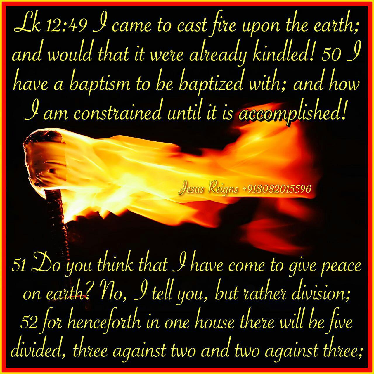 49 "I came to cast fire upon the earth; and would that it were already kindled! 50 I have a baptism to be baptized with; and how I am constrained until it is accomplished! 51 Do you think that I have come to give peace on earth? No, I tell you, but rather division; 52 for henceforth in one house there will be five divided, three against two and two against three; 53 they will be divided, father against son and son against father, mother against daughter and daughter against her mother, mother-in-law against her daughter-in-law and daughter-in-law against her mother-in-law."