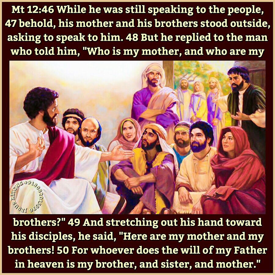 46 While he was still speaking to the people, 47 behold, his mother and his brothers stood outside, asking to speak to him. 48 But he replied to the man who told him, "Who is my mother, and who are my brothers?" 49 And stretching out his hand toward his disciples, he said, "Here are my mother and my brothers! 50 For whoever does the will of my Father in heaven is my brother, and sister, and mother."