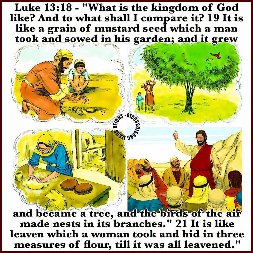 18 He said therefore, "What is the kingdom of God like? And to what shall I compare it? 19 It is like a grain of mustard seed which a man took and sowed in his garden; and it grew and became a tree, and the birds of the air made nests in its branches." 20 And again he said, "To what shall I compare the kingdom of God? 21 It is like leaven which a woman took and hid in three measures of flour, till it was all leavened."