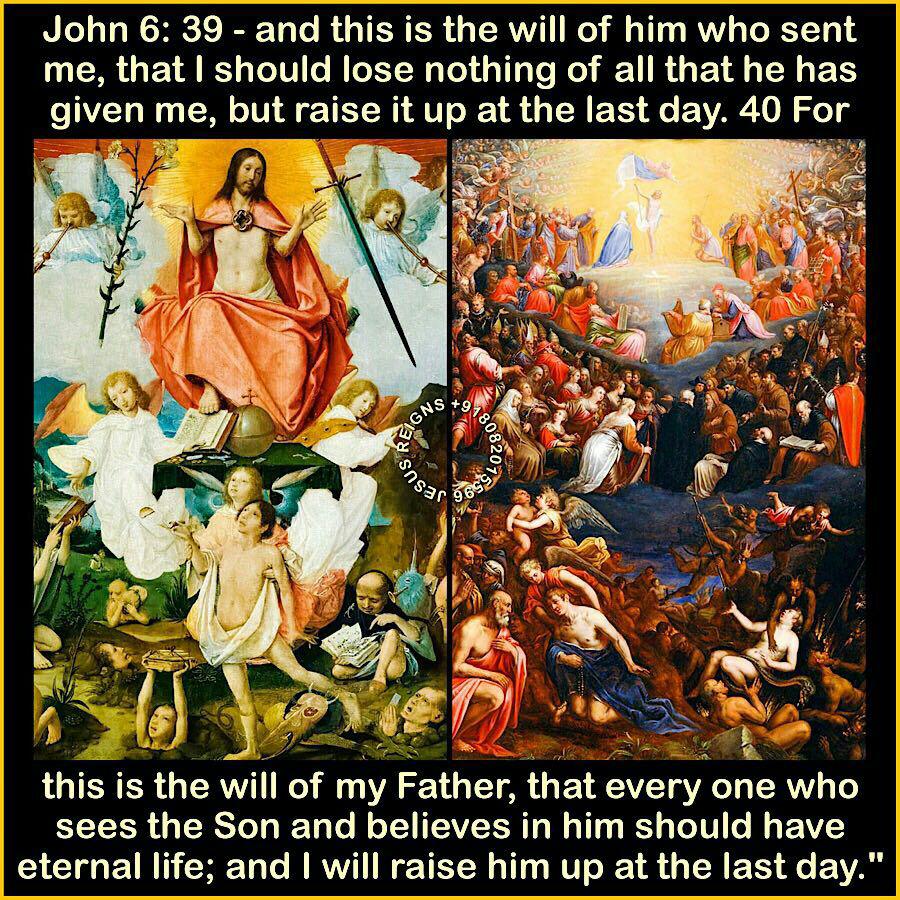 37 All that the Father gives me will come to me; and him who comes to me I will not cast out. 38 For I have come down from heaven, not to do my own will, but the will of him who sent me; 39 and this is the will of him who sent me, that I should lose nothing of all that he has given me, but raise it up at the last day. 40 For this is the will of my Father, that every one who sees the Son and believes in him should have eternal life; and I will raise him up at the last day."