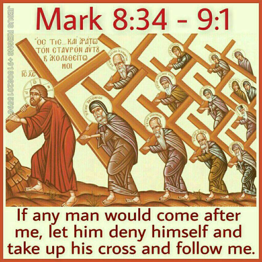 34 And he called to him the multitude with his disciples, and said to them, "If any man would come after me, let him deny himself and take up his cross and follow me. 35 For whoever would save his life will lose it; and whoever loses his life for my sake and the gospel's will save it. 36 For what does it profit a man, to gain the whole world and forfeit his life? 37 For what can a man give in return for his life? 38 For whoever is ashamed of me and of my words in this adulterous and sinful generation, of him will the Son of man also be ashamed, when he comes in the glory of his Father with the holy angels." 1 And he said to them, "Truly, I say to you, there are some standing here who will not taste death before they see that the kingdom of God has come with power."