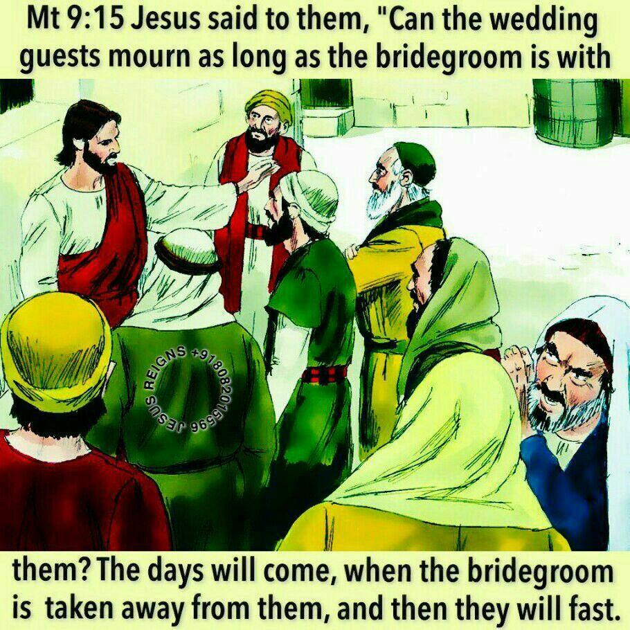 14 Then the disciples of John came to him, saying, "Why do we and the Pharisees fast, but your disciples do not fast?" 15 And Jesus said to them, "Can the wedding guests mourn as long as the bridegroom is with them? The days will come, when the bridegroom is taken away from them, and then they will fast.