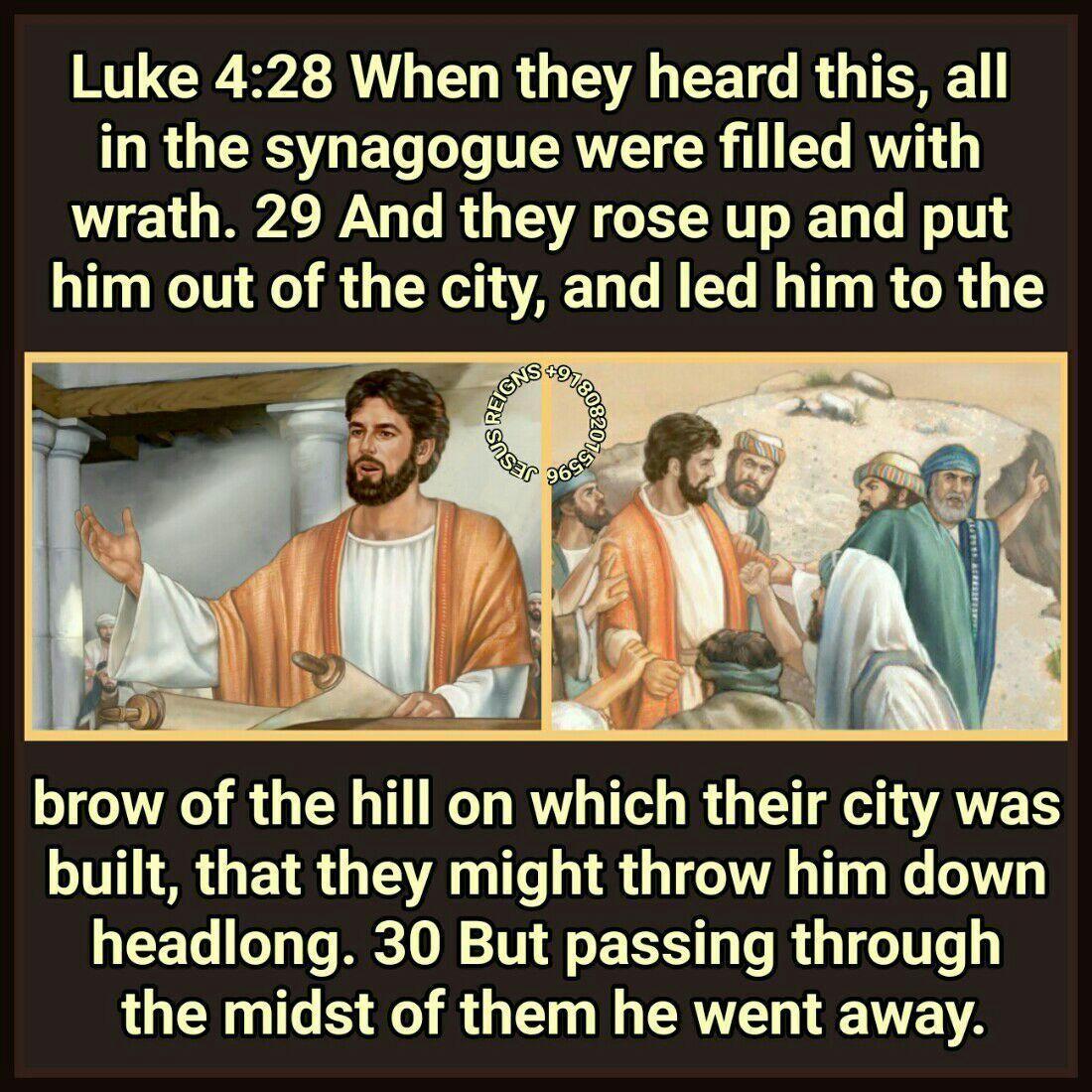 24 And he said, "Truly, I say to you, no prophet is acceptable in his own country. 25 But in truth, I tell you, there were many widows in Israel in the days of Elijah, when the heaven was shut up three years and six months, when there came a great famine over all the land; 26 and Elijah was sent to none of them but only to Zarephath, in the land of Sidon, to a woman who was a widow. 27 And there were many lepers in Israel in the time of the prophet Elisha; and none of them was cleansed, but only Naaman the Syrian." 28 When they heard this, all in the synagogue were filled with wrath. 29 And they rose up and put him out of the city, and led him to the brow of the hill on which their city was built, that they might throw him down headlong. 30 But passing through the midst of them he went away.