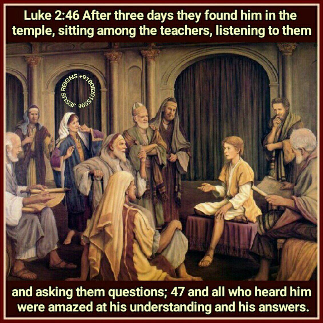 41 Now his parents went to Jerusalem every year at the feast of the Passover. 42 And when he was twelve years old, they went up according to custom; 43 and when the feast was ended, as they were returning, the boy Jesus stayed behind in Jerusalem. His parents did not know it, 44 but supposing him to be in the company they went a day's journey, and they sought him among their kinsfolk and acquaintances; 45 and when they did not find him, they returned to Jerusalem, seeking him. 46 After three days they found him in the temple, sitting among the teachers, listening to them and asking them questions; 47 and all who heard him were amazed at his understanding and his answers. 48 And when they saw him they were astonished; and his mother said to him, "Son, why have you treated us so? Behold, your father and I have been looking for you anxiously." 49 And he said to them, "How is it that you sought me? Did you not know that I must be in my Father's house?" 50 And they did not understand the saying which he spoke to them. 51 And he went down with them and came to Nazareth, and was obedient to them; and his mother kept all these things in her heart.