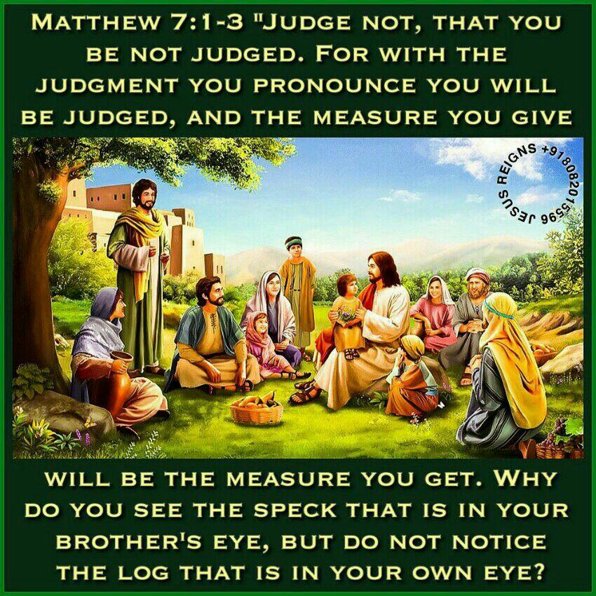 1 "Judge not, that you be not judged. 2 For with the judgment you pronounce you will be judged, and the measure you give will be the measure you get. 3 Why do you see the speck that is in your brother's eye, but do not notice the log that is in your own eye? 4 Or how can you say to your brother, `Let me take the speck out of your eye,' when there is the log in your own eye? 5 You hypocrite, first take the log out of your own eye, and then you will see clearly to take the speck out of your brother's eye.