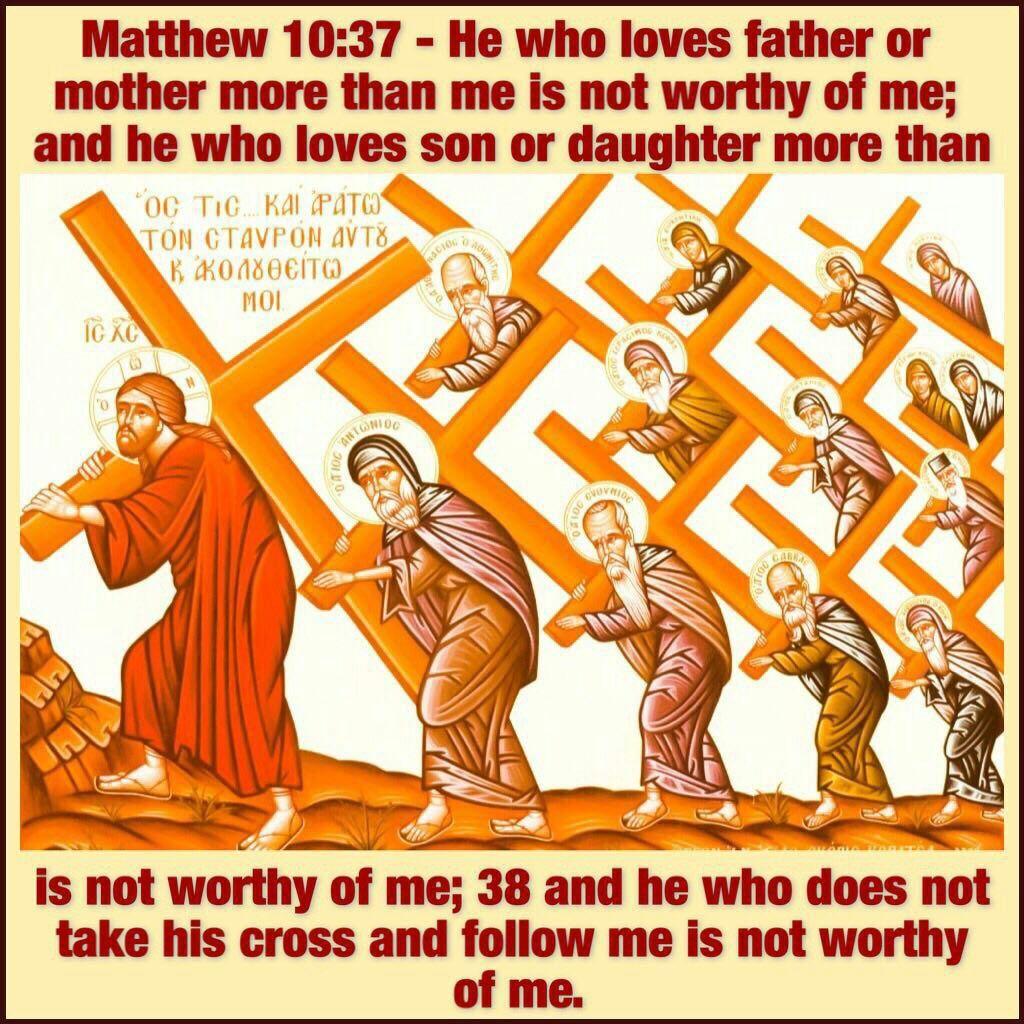37 He who loves father or mother more than me is not worthy of me; and he who loves son or daughter more than me is not worthy of me; 38 and he who does not take his cross and follow me is not worthy of me. 39 He who finds his life will lose it, and he who loses his life for my sake will find it. 40 "He who receives you receives me, and he who receives me receives him who sent me. 41 He who receives a prophet because he is a prophet shall receive a prophet's reward, and he who receives a righteous man because he is a righteous man shall receive a righteous man's reward. 42 And whoever gives to one of these little ones even a cup of cold water because he is a disciple, truly, I say to you, he shall not lose his reward."