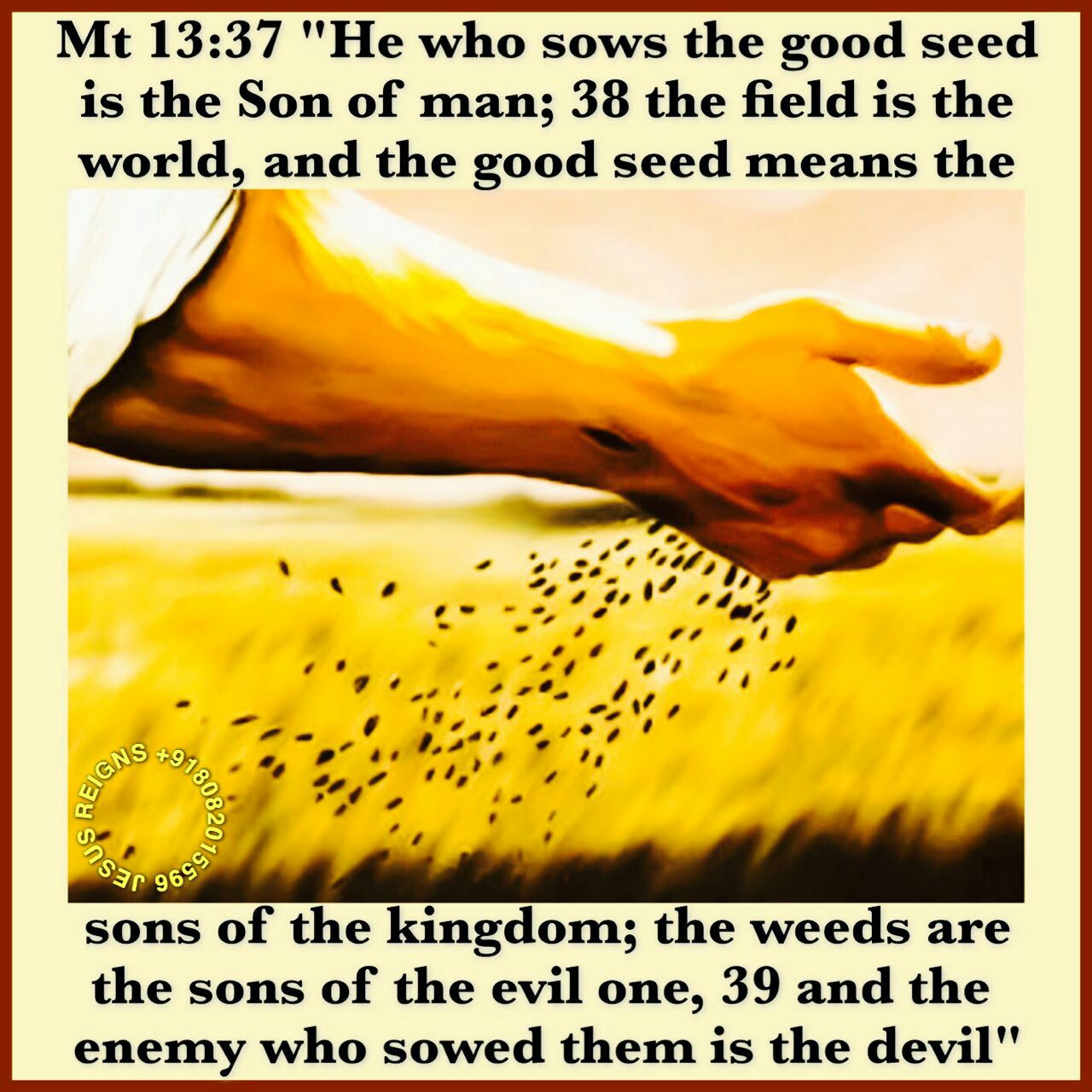 24 Another parable he put before them, saying, "The kingdom of heaven may be compared to a man who sowed good seed in his field; 25 but while men were sleeping, his enemy came and sowed weeds among the wheat, and went away. 26 So when the plants came up and bore grain, then the weeds appeared also. 27 And the servants of the householder came and said to him, Sir, did you not sow good seed in your field? How then has it weeds?' 28 He said to them, An enemy has done this.' The servants said to him, Then do you want us to go and gather them?' 29 But he said, `No; lest in gathering the weeds you root up the wheat along with them. 30 Let both grow together until the harvest; and at harvest time I will tell the reapers, Gather the weeds first and bind them in bundles to be burned, but gather the wheat into my barn.'" 31 Another parable he put before them, saying, "The kingdom of heaven is like a grain of mustard seed which a man took and sowed in his field; 32 it is the smallest of all seeds, but when it has grown it is the greatest of shrubs and becomes a tree, so that the birds of the air come and make nests in its branches." 33 He told them another parable. "The kingdom of heaven is like leaven which a woman took and hid in three measures of flour, till it was all leavened." 34 All this Jesus said to the crowds in parables; indeed he said nothing to them without a parable. 35 This was to fulfill what was spoken by the prophet: "I will open my mouth in parables, I will utter what has been hidden since the foundation of the world." 36 Then he left the crowds and went into the house. And his disciples came to him, saying, "Explain to us the parable of the weeds of the field." 37 He answered, "He who sows the good seed is the Son of man; 38 the field is the world, and the good seed means the sons of the kingdom; the weeds are the sons of the evil one, 39 and the enemy who sowed them is the devil; the harvest is the close of the age, and the reapers are angels. 40 Just as the weeds are gathered and burned with fire, so will it be at the close of the age. 41 The Son of man will send his angels, and they will gather out of his kingdom all causes of sin and all evildoers, 42 and throw them into the furnace of fire; there men will weep and gnash their teeth. 43 Then the righteous will shine like the sun in the kingdom of their Father. He who has ears, let him hear."