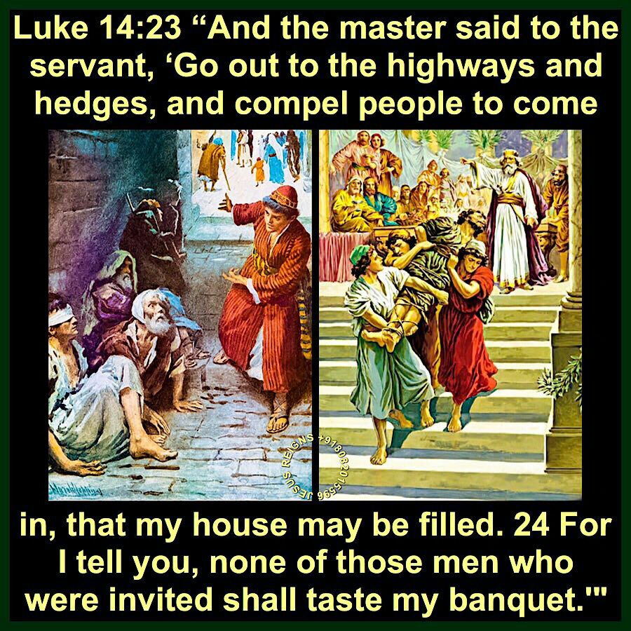 15 When one of those who sat at table with him heard this, he said to him, "Blessed is he who shall eat bread in the kingdom of God!" 16 But he said to him, "A man once gave a great banquet, and invited many; 17 and at the time for the banquet he sent his servant to say to those who had been invited, `Come; for all is now ready.' 18 But they all alike began to make excuses. The first said to him, `I have bought a field, and I must go out and see it; I pray you, have me excused.' 19 And another said, `I have bought five yoke of oxen, and I go to examine them; I pray you, have me excused.' 20 And another said, `I have married a wife, and therefore I cannot come.' 21 So the servant came and reported this to his master. Then the householder in anger said to his servant, `Go out quickly to the streets and lanes of the city, and bring in the poor and maimed and blind and lame.' 22 And the servant said, `Sir, what you commanded has been done, and still there is room.' 23 And the master said to the servant, `Go out to the highways and hedges, and compel people to come in, that my house may be filled. 24 For I tell you, none of those men who were invited shall taste my banquet.'"