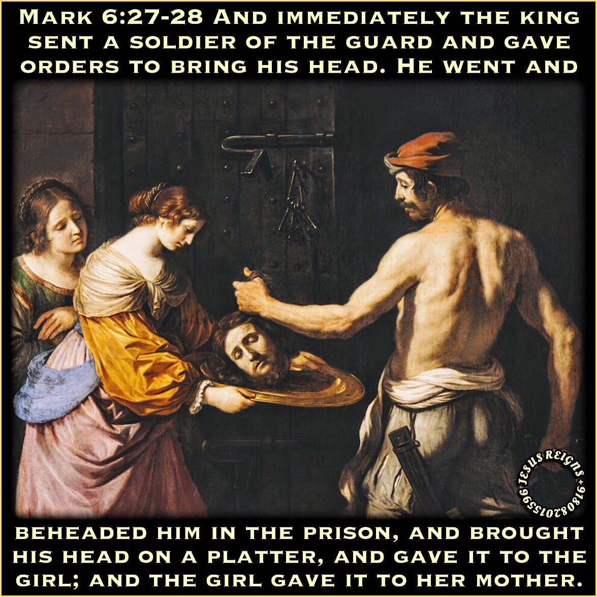 21 But an opportunity came when Herod on his birthday gave a banquet for his courtiers and officers and the leading men of Galilee. 22 For when Herodias' daughter came in and danced, she pleased Herod and his guests; and the king said to the girl, "Ask me for whatever you wish, and I will grant it." 23 And he vowed to her, "Whatever you ask me, I will give you, even half of my kingdom." 24 And she went out, and said to her mother, "What shall I ask?" And she said, "The head of John the baptizer." 25 And she came in immediately with haste to the king, and asked, saying, "I want you to give me at once the head of John the Baptist on a platter." 26 And the king was exceedingly sorry; but because of his oaths and his guests he did not want to break his word to her. 27 And immediately the king sent a soldier of the guard and gave orders to bring his head. He went and beheaded him in the prison, 28 and brought his head on a platter, and gave it to the girl; and the girl gave it to her mother. 29 When his disciples heard of it, they came and took his body, and laid it in a tomb.