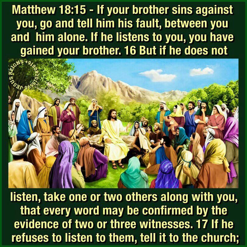 15 "If your brother sins against you, go and tell him his fault, between you and him alone. If he listens to you, you have gained your brother. 16 But if he does not listen, take one or two others along with you, that every word may be confirmed by the evidence of two or three witnesses. 17 If he refuses to listen to them, tell it to the church; and if he refuses to listen even to the church, let him be to you as a Gentile and a tax collector. 18 Truly, I say to you, whatever you bind on earth shall be bound in heaven, and whatever you loose on earth shall be loosed in heaven. 19 Again I say to you, if two of you agree on earth about anything they ask, it will be done for them by my Father in heaven. 20 For where two or three are gathered in my name, there am I in the midst of them."