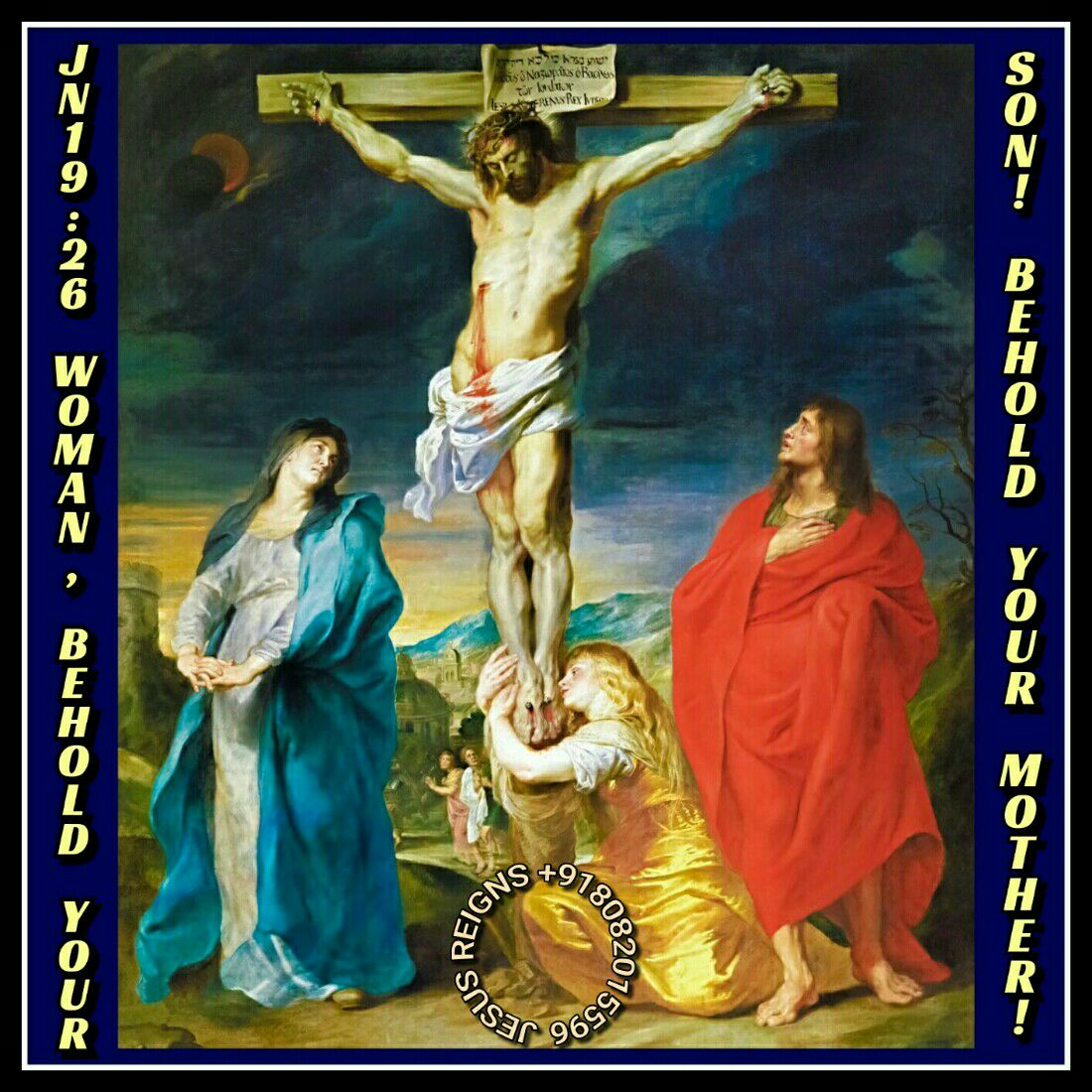 But standing by the cross of Jesus were his mother, and his mother's sister, Mary the wife of Clopas, and Mary Magdalene. When Jesus saw his mother, and the disciple whom he loved standing near, he said to his mother, 'Woman, behold, your son!' Then he said to the disciple, 'Behold, your mother!' And from that hour the disciple took her to his own home.