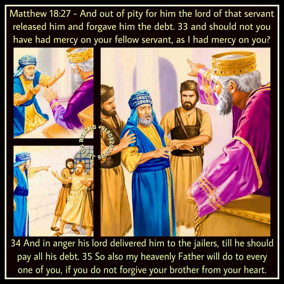 21 Then Peter came up and said to him, "Lord, how often shall my brother sin against me, and I forgive him? As many as seven times?" 22 Jesus said to him, "I do not say to you seven times, but seventy times seven.23 "Therefore the kingdom of heaven may be compared to a king who wished to settle accounts with his servants. 24 When he began the reckoning, one was brought to him who owed him ten thousand talents; 25 and as he could not pay, his lord ordered him to be sold, with his wife and children and all that he had, and payment to be made. 26 So the servant fell on his knees, imploring him, Lord, have patience with me, and I will pay you everything.' 27 And out of pity for him the lord of that servant released him and forgave him the debt. 28 But that same servant, as he went out, came upon one of his fellow servants who owed him a hundred denarii; and seizing him by the throat he said, Pay what you owe.' 29 So his fellow servant fell down and besought him, Have patience with me, and I will pay you.' 30 He refused and went and put him in prison till he should pay the debt. 31 When his fellow servants saw what had taken place, they were greatly distressed, and they went and reported to their lord all that had taken place. 32 Then his lord summoned him and said to him, You wicked servant! I forgave you all that debt because you besought me; 33 and should not you have had mercy on your fellow servant, as I had mercy on you?' 34 And in anger his lord delivered him to the jailers, till he should pay all his debt. 35 So also my heavenly Father will do to every one of you, if you do not forgive your brother from your heart."